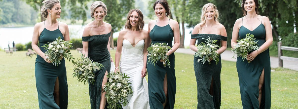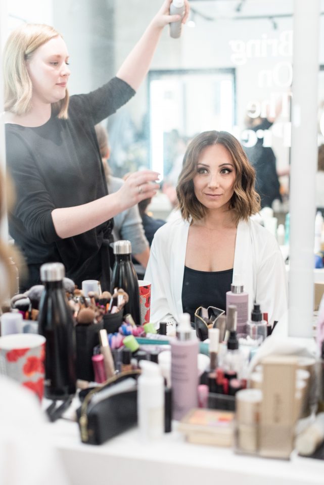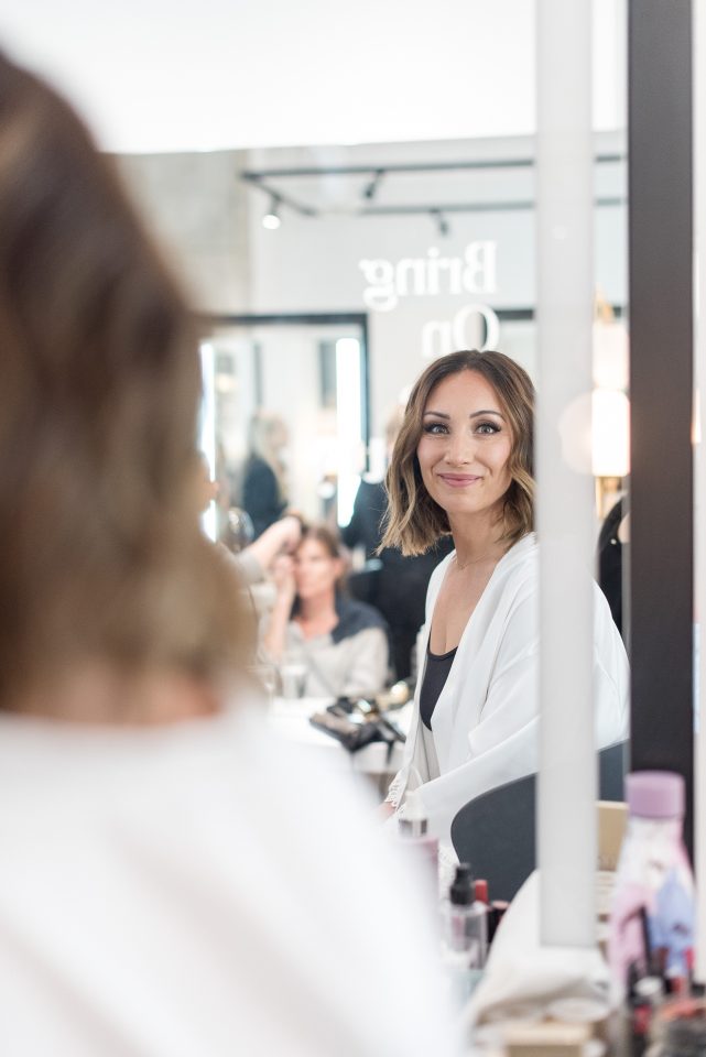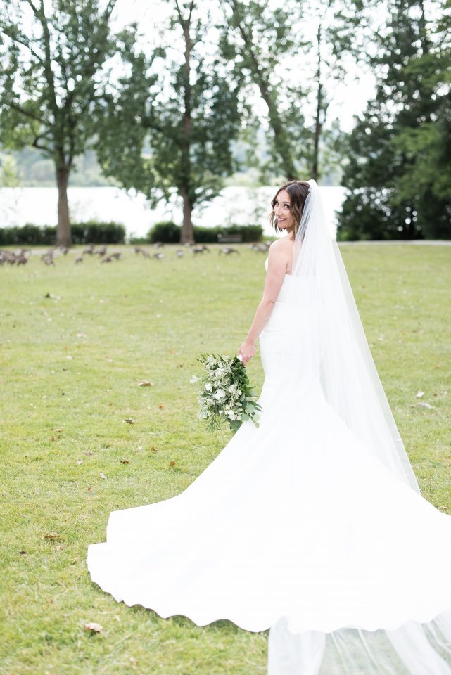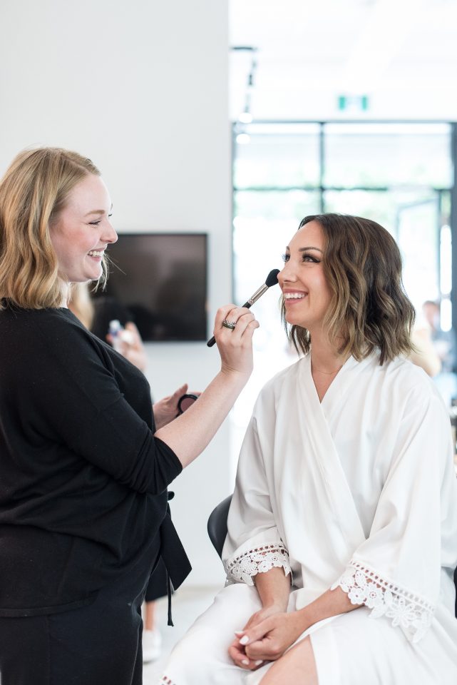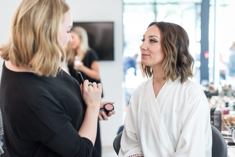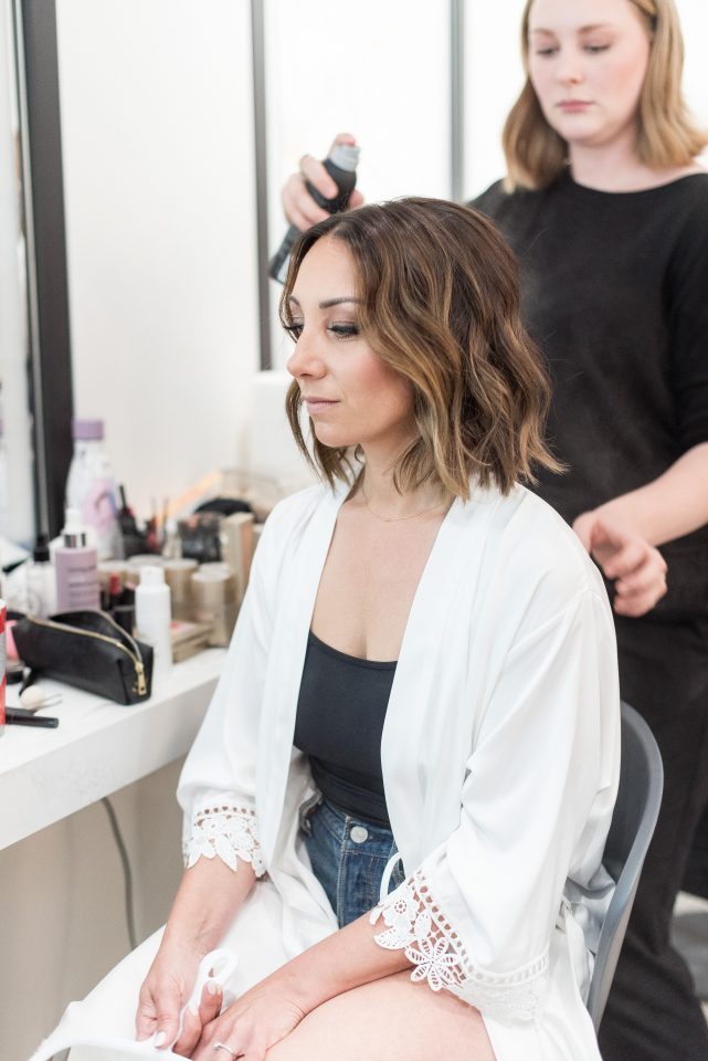 Nicole’s bridal look was playful & glamorous! Sarah, our senior hair & makeup artist, used warm earth tone eye shadow shades to really enhance Nicole’s stunning green eyes! A flirtatious cat-eye style eyeliner applied to her upper lash line along with false mink lashes really made her eyes pop! Nicole’s complexion was evened out with a luminous foundation, and to give her cheeks a nice glow, Sarah applied a delicate rosy-pink blush. To achieve a rich, even lip colour our bride chose a soft matte nude lip crayon. Sarah styled Nicole’s hair into soft tousled waves, which delicately framed her face. The bridal look was complete and Nicole was ready to walk down the aisle!