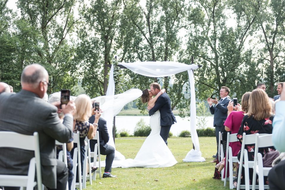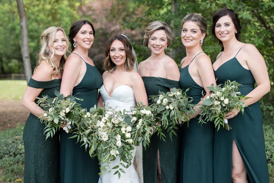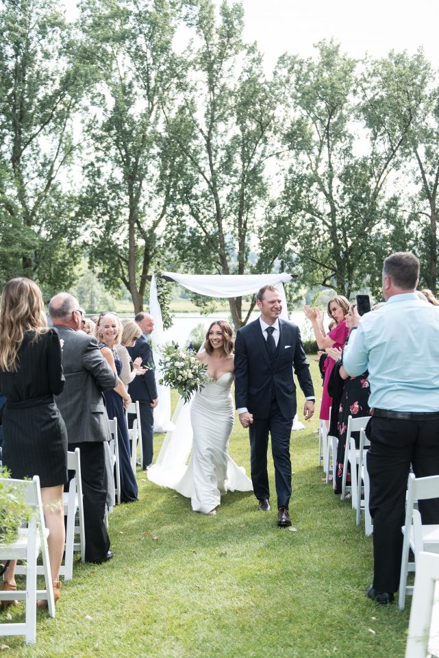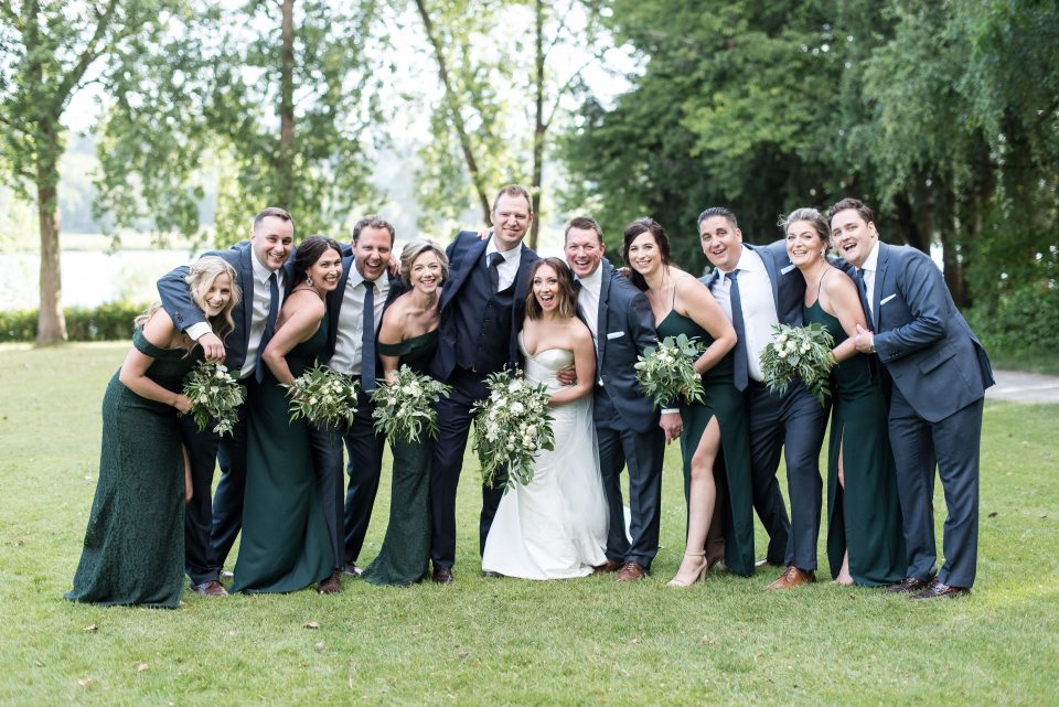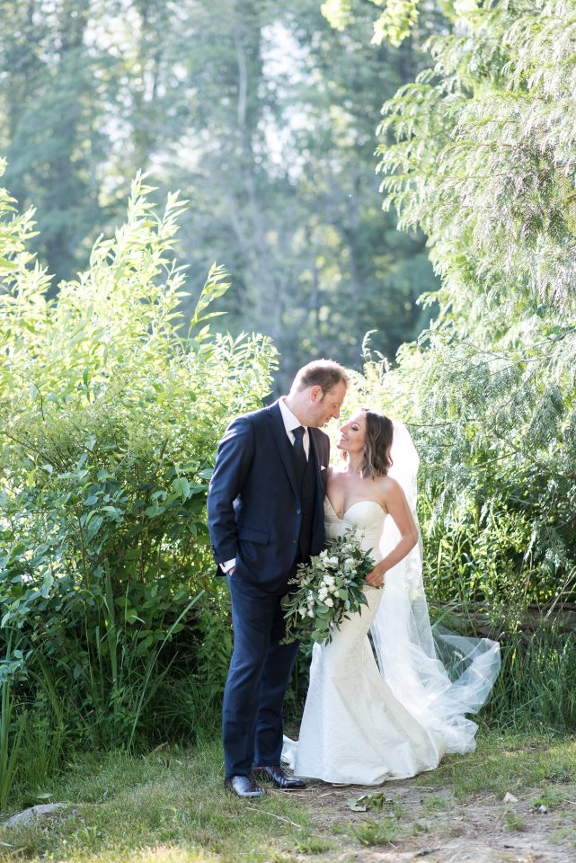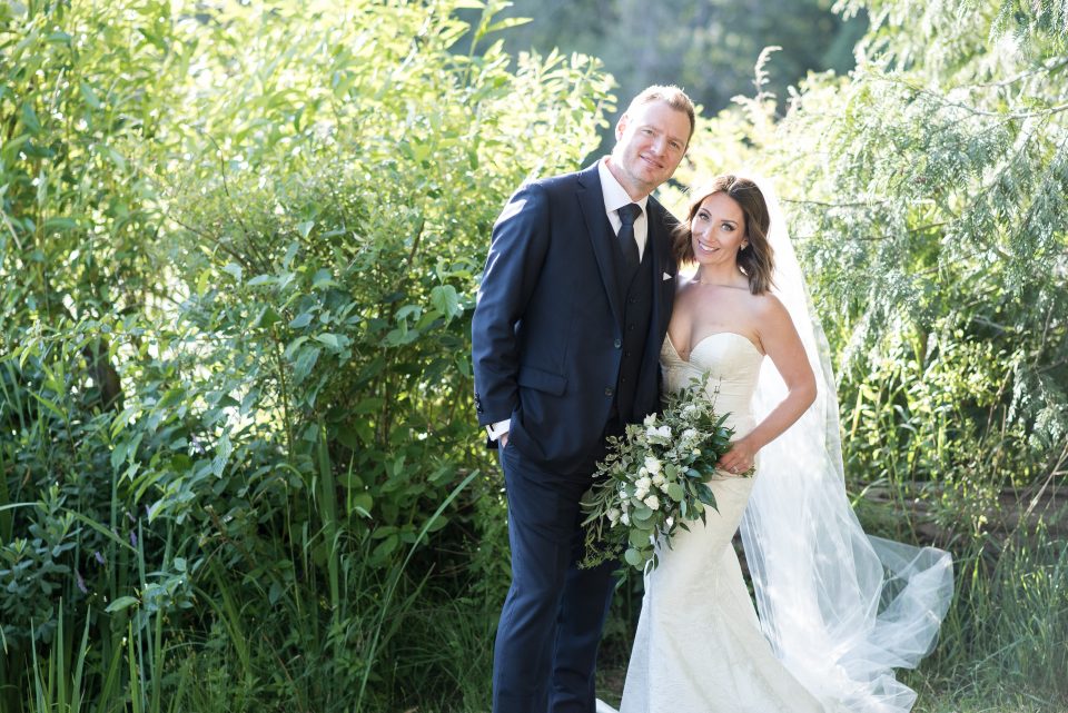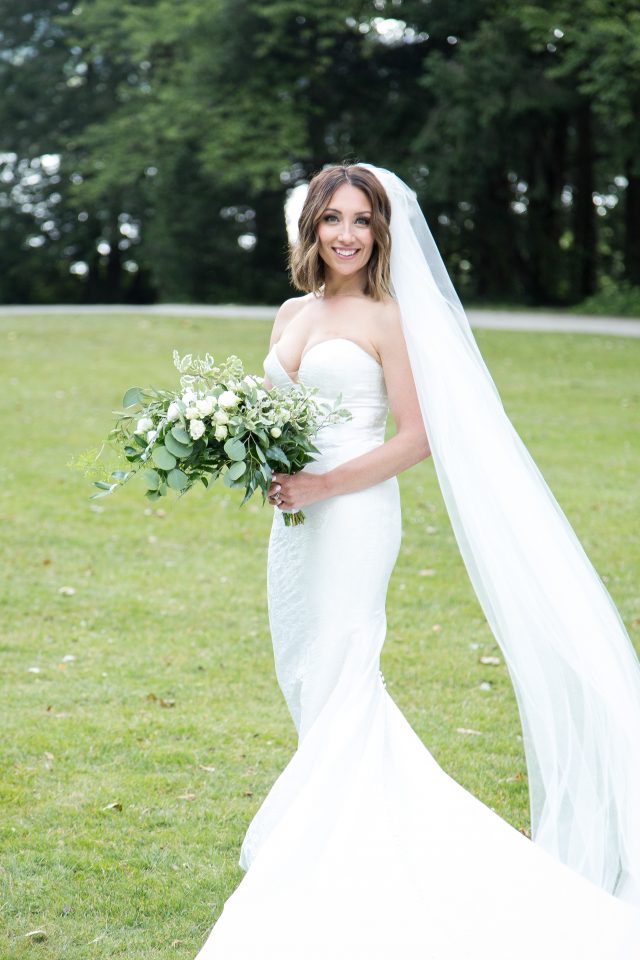 Nicole’s bridal look was playful & glamorous! Sarah, our senior hair & makeup artist, used warm earth tone eye shadow shades to really enhance Nicole’s stunning green eyes! A flirtatious cat-eye style eyeliner applied to her upper lash line along with false mink lashes really made her eyes pop! Nicole’s complexion was evened out with a luminous foundation, and to give her cheeks a nice glow, Sarah applied a delicate rosy-pink blush. To achieve a rich, even lip colour our bride chose a soft matte nude lip crayon. Sarah styled Nicole’s hair into soft tousled waves, which delicately framed her face. The bridal look was complete and Nicole was ready to walk down the aisle!