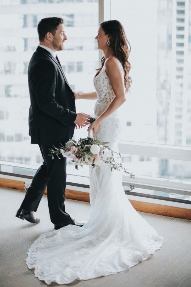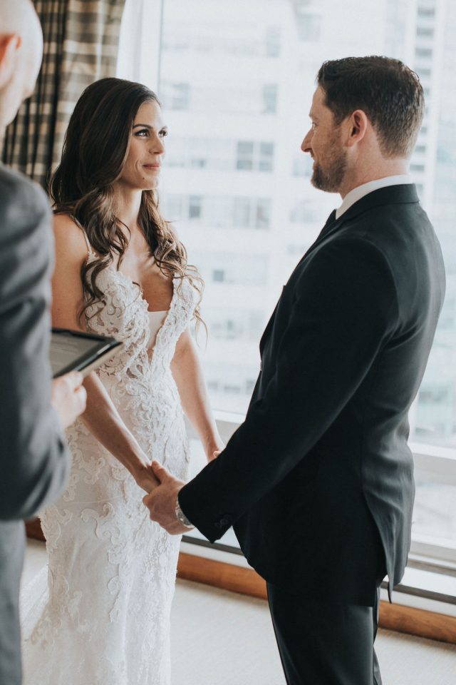 We are excited to share a unique elopement for our couple, Joey and Jason on the blog today! They kept things super simple and intimate with an elopement style ceremony in their hotel room at the Fairmont Pacific Rim hotel room. Followed by dinner downstairs at Giovane Cafe with their closest friends and family.