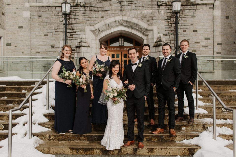 Our attention goes to Sarah & Brandon on this Wedding Wednesday! This stunning couple had a beautiful February Winter wedding in Vancouver. The bride was stunning in a cap sleeve beaded gown, while her bridesmaids were a sophisticated vision in all black. For the bridal look, our Senior Artist Jenny chose to accentuate the eyes…
