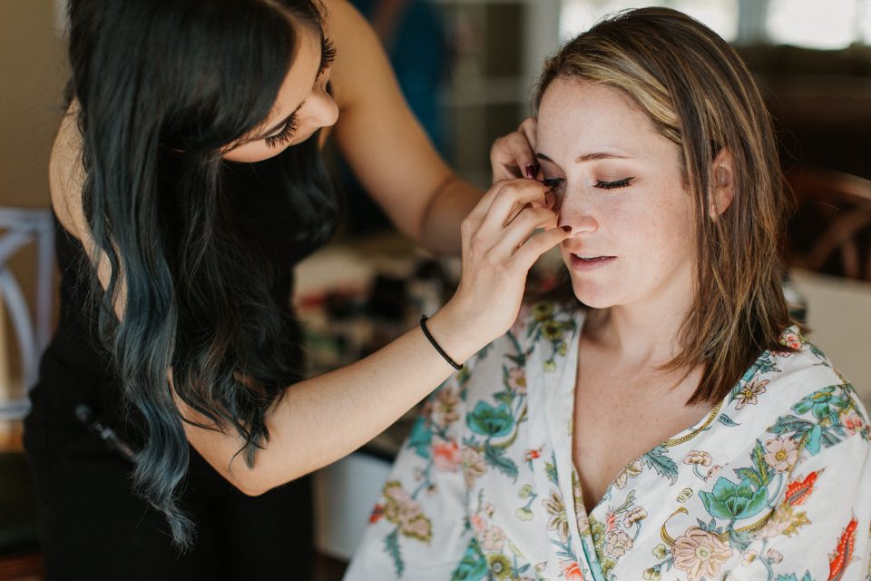 For the bridal look, our Senior Artist Jenny chose to accentuate the eyes and cheeks with soft, warm tones. The bride looked so pretty in peachy blush on the apples of the cheeks finished with a soft golden glow for her big day! Flirty lashes were added to complete this stunning look.