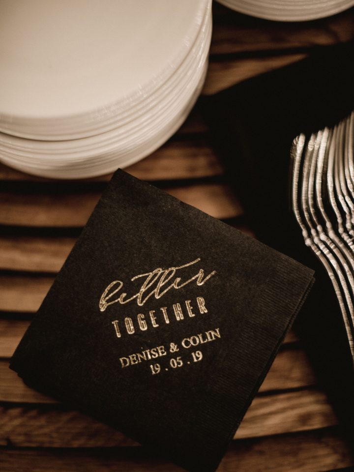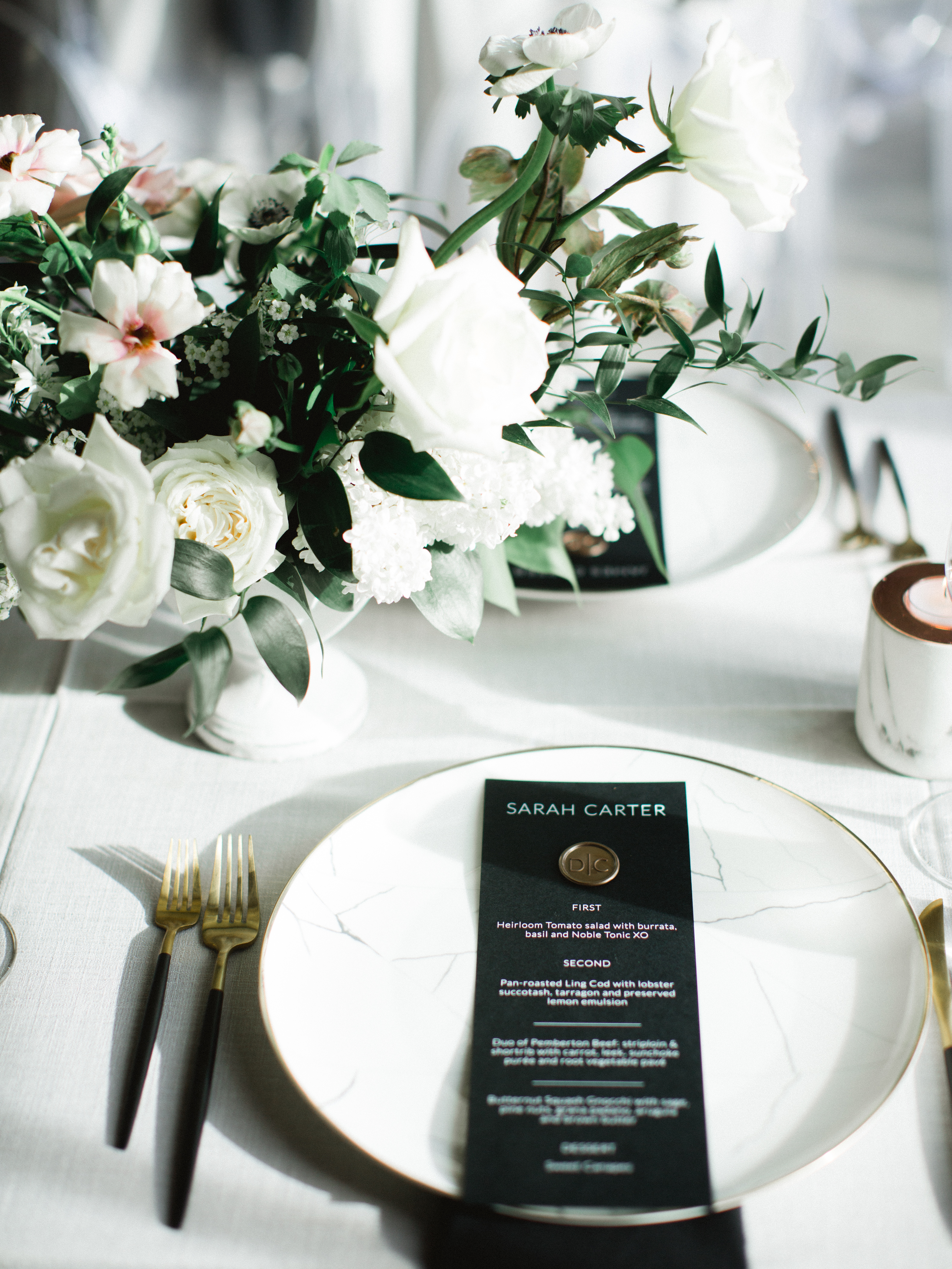 Violet Grey did the stationary for the wedding. Her attention to detail was very impressive and everything was just perfect. Some of my favourite details from the tablescape were the gold and black cutlery and the marble chargers from Winston’s in Vancouver! I love how crisp and clean the room looked 🙂