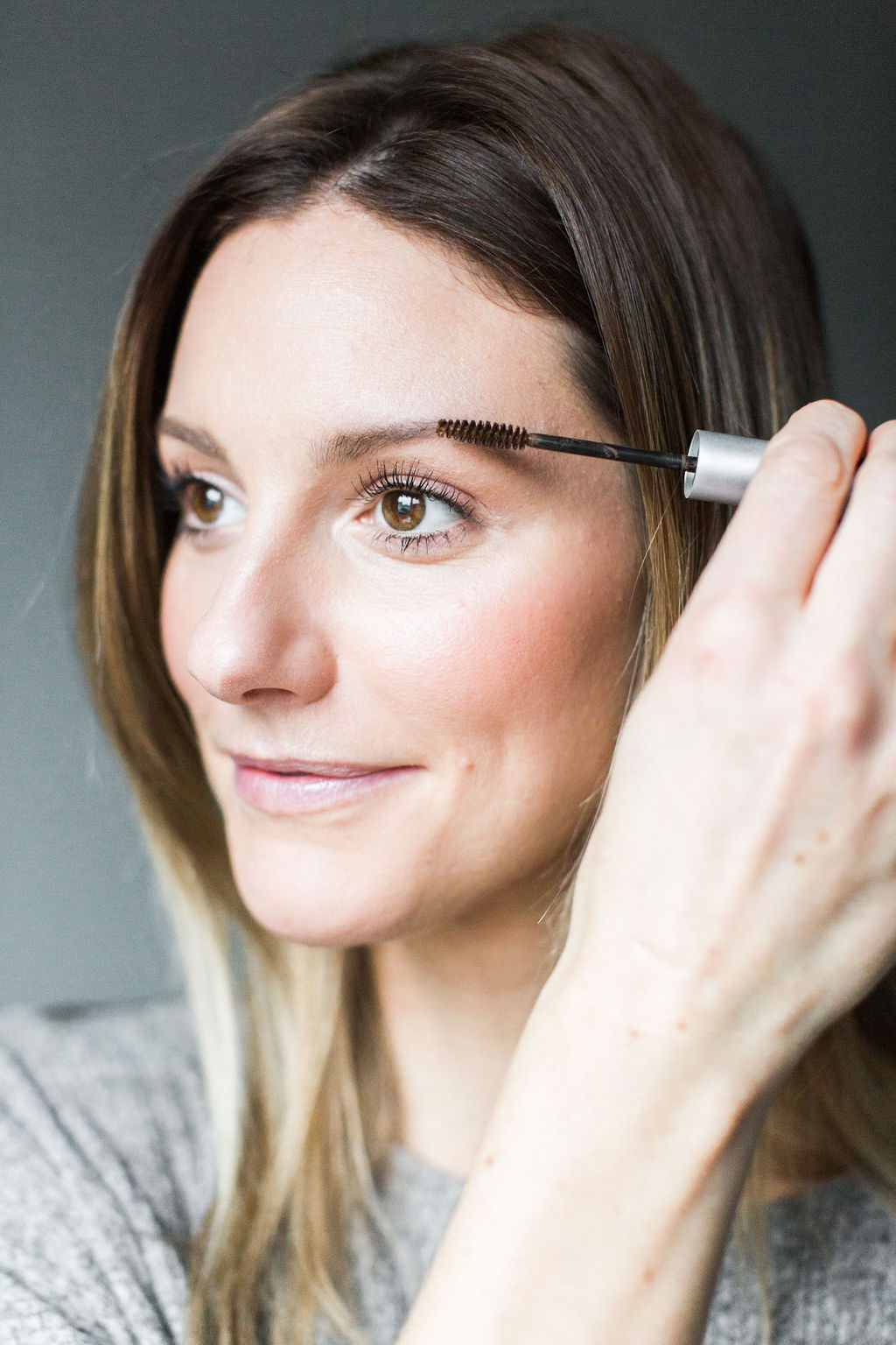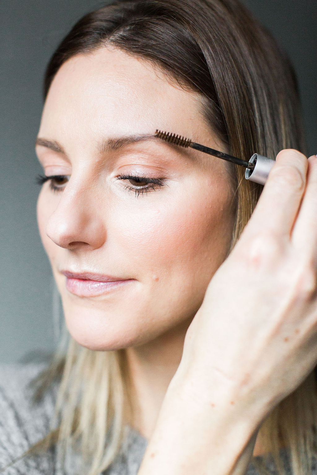 Define the eyebrows using Glo skin Brow Gel, brushing the hairs upward for fuller brow effect.