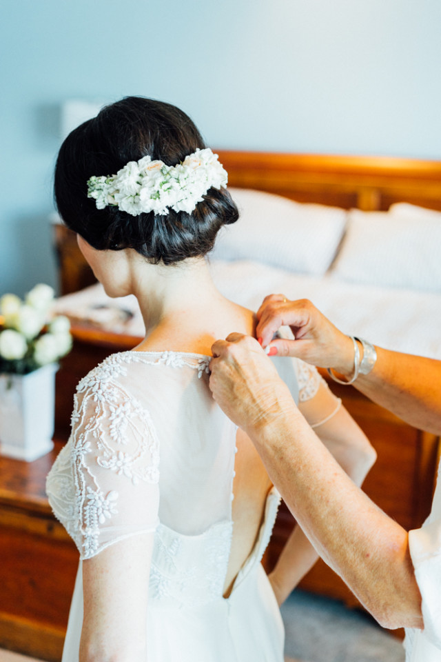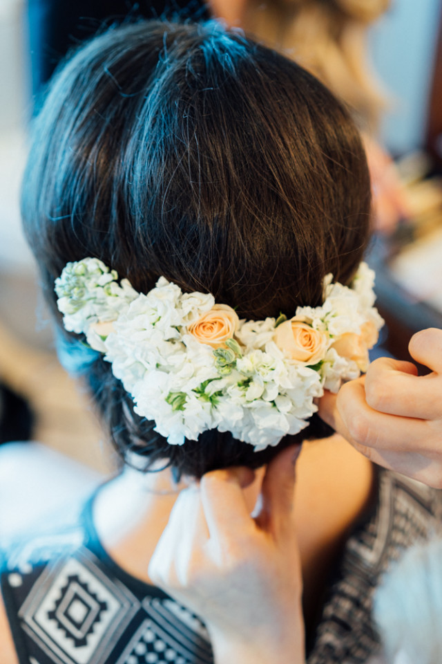 Samantha (one of my senior hair stylists) created a soft and romantic up do to showcase Megan’s dress, using volume at the roots and lovely florals pinned into the low bun. I love the florals Jennifer at Special Moments chose, the updo was very elegant on Megan!