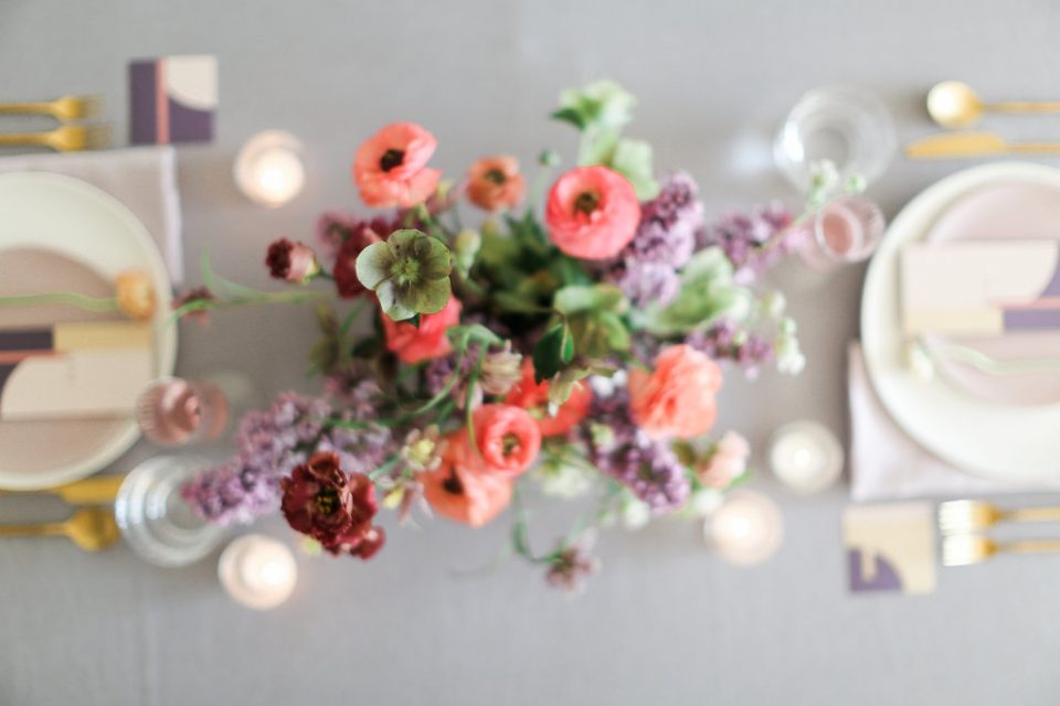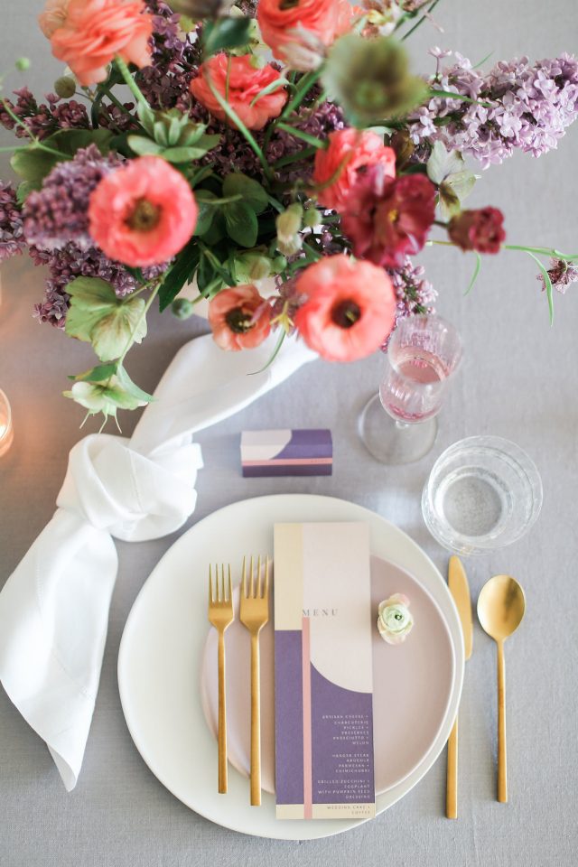 The pop of colour from the florals was perfectly accented with gold-brushed cutlery and muted menu templates reflecting the bouquet tones. Table-setting design and planning for this shoot was effortlessly executed by the talented team at Spread Love Events!