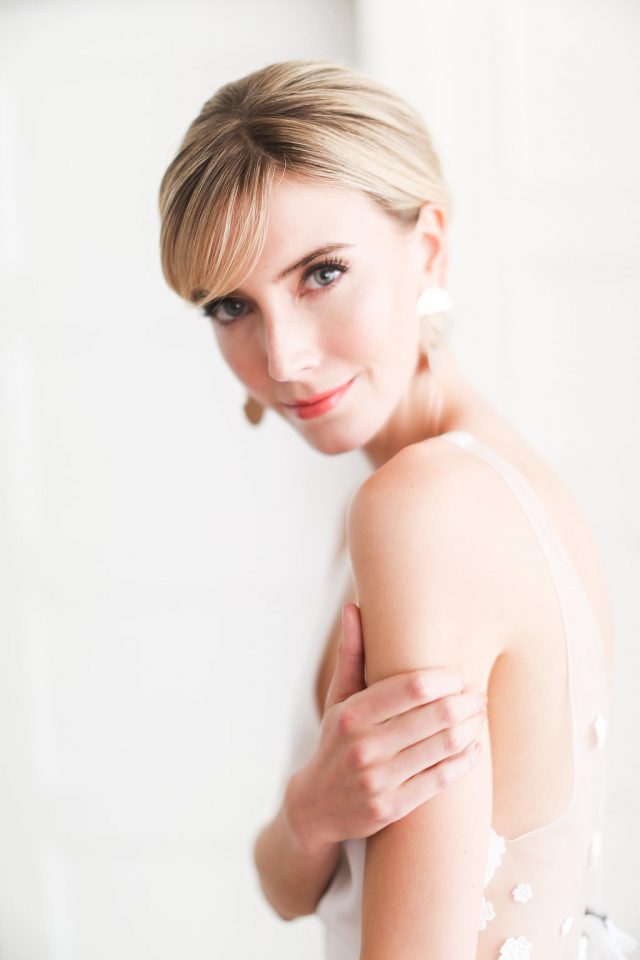For the makeup, Denise chose to go with a look suited for the modern bride. Keeping the eyes and skin simple created the perfect canvas for a soft, coral lip with a hint of shine. Our Senior Stylist, Alicia, followed with the minimalist modern vibe and created this sleek and chic low chiffon bun- perfect for brides with bangs!