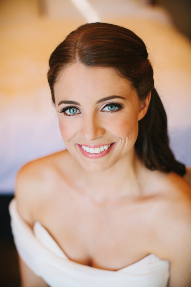 With Brittany’s piercing blue eyes it was a no brainer which colour palette and tones to use on her eyes cheeks and lips. Brittany was comfortable with trying whatever I suggested and trusted I would make her look her absolute best! For her eyes, we chose a champagne rose colour swept all over the lower lid with a taupe shadow contoured in her crease to create a more sculpted look. We then finished off the eyes with a black gel liner right at the lash line and softly smudged shadow on top and on the lower lash line to create more intensity.
