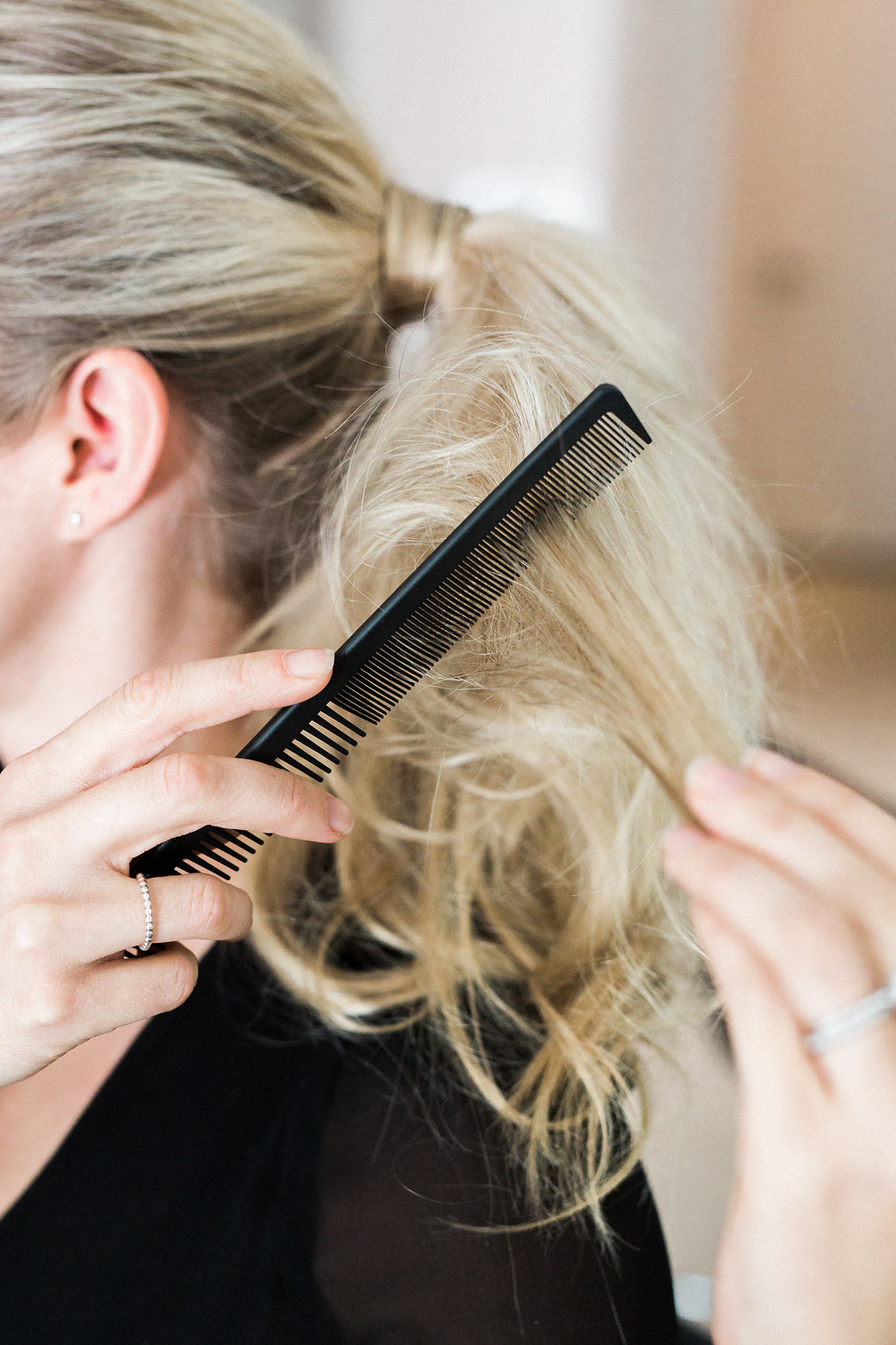 After back combing, smooth out the hair by lightly combing through around the top, comb through your curls lightly to make them softer. Gather hair and pull it all in a pony at the desired height you want, using a comb or brush. Use a thin clear elastic to tie it (this makes it easier to hide when wrapping the hair strand around).